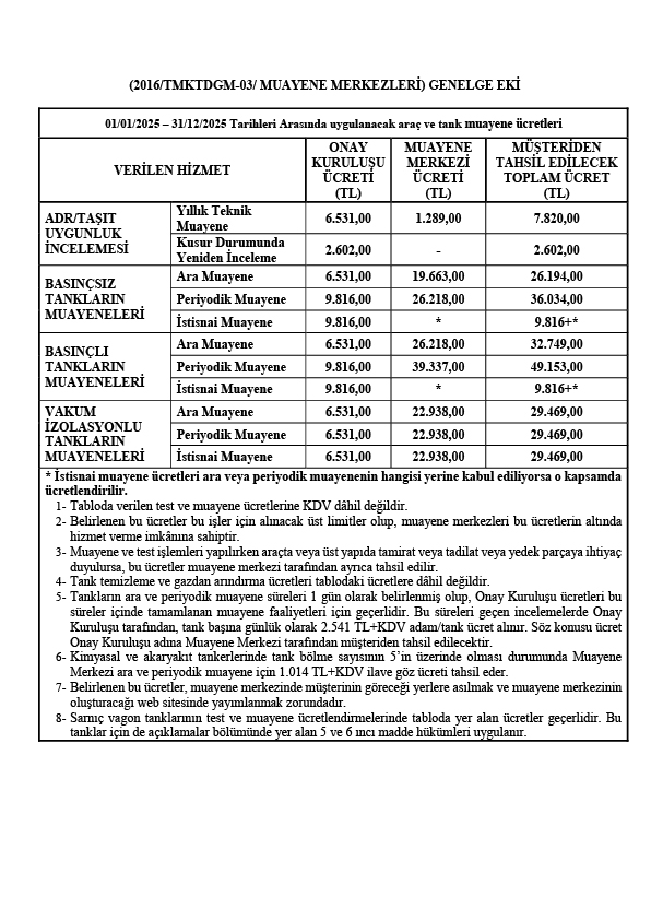 Ulaştırma ve Altyapı Bakanlı Tarafından ADR Araç Uygunluk Muayenesi (T9 İncelemesi) ve Tank Muayenesi Yapmaya Yetkilendirilmiş