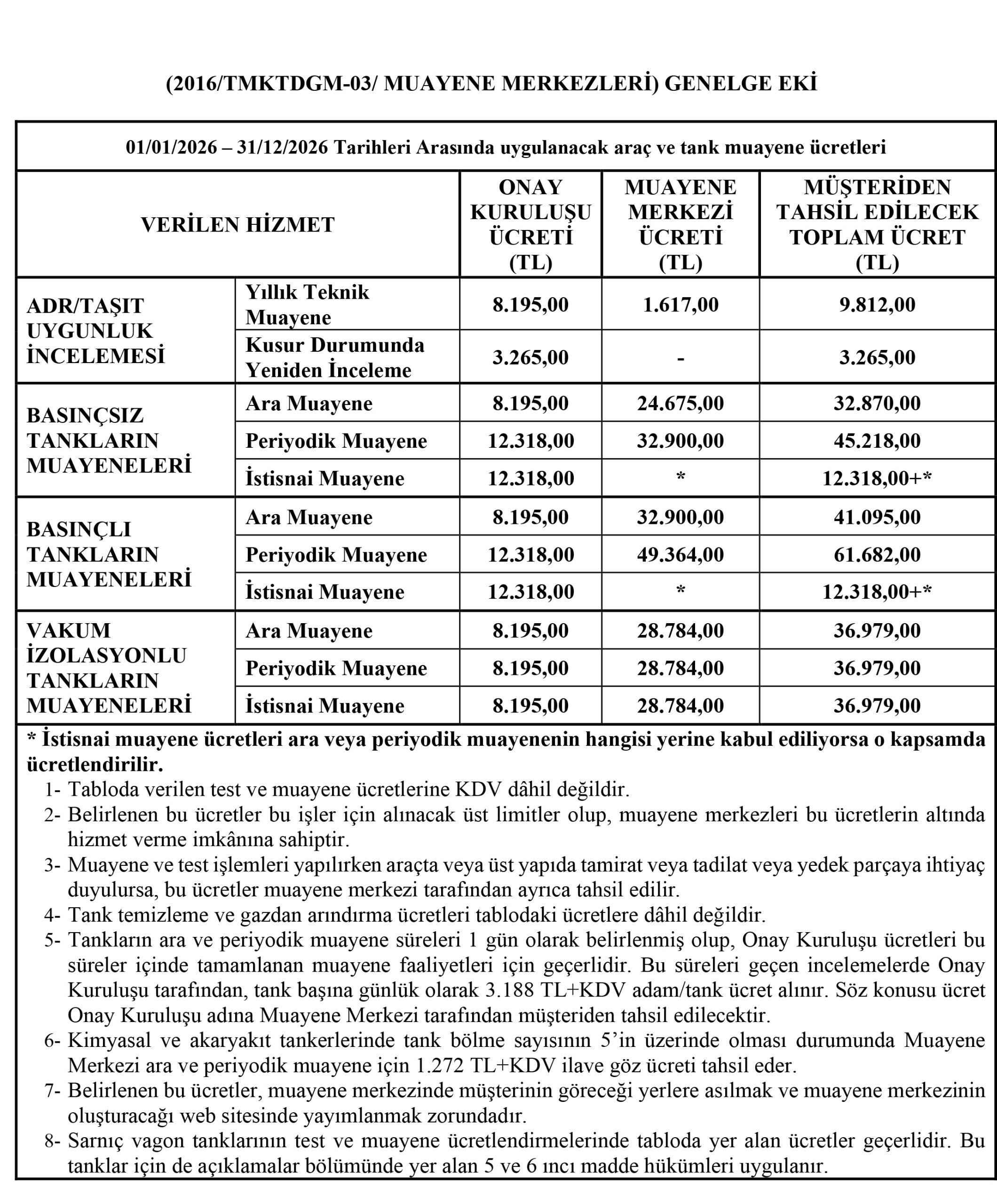 TSE’nin yetkilendirmiş olduğu kurumlarda ( LPG, AKARYAKIT, KRİYOJENİK ARACI) vb. gibi Tankların. Her 3 yılda bir Ara Muayene, Her 6 yılda bir Periyodik muayeneye tabi tutulur.